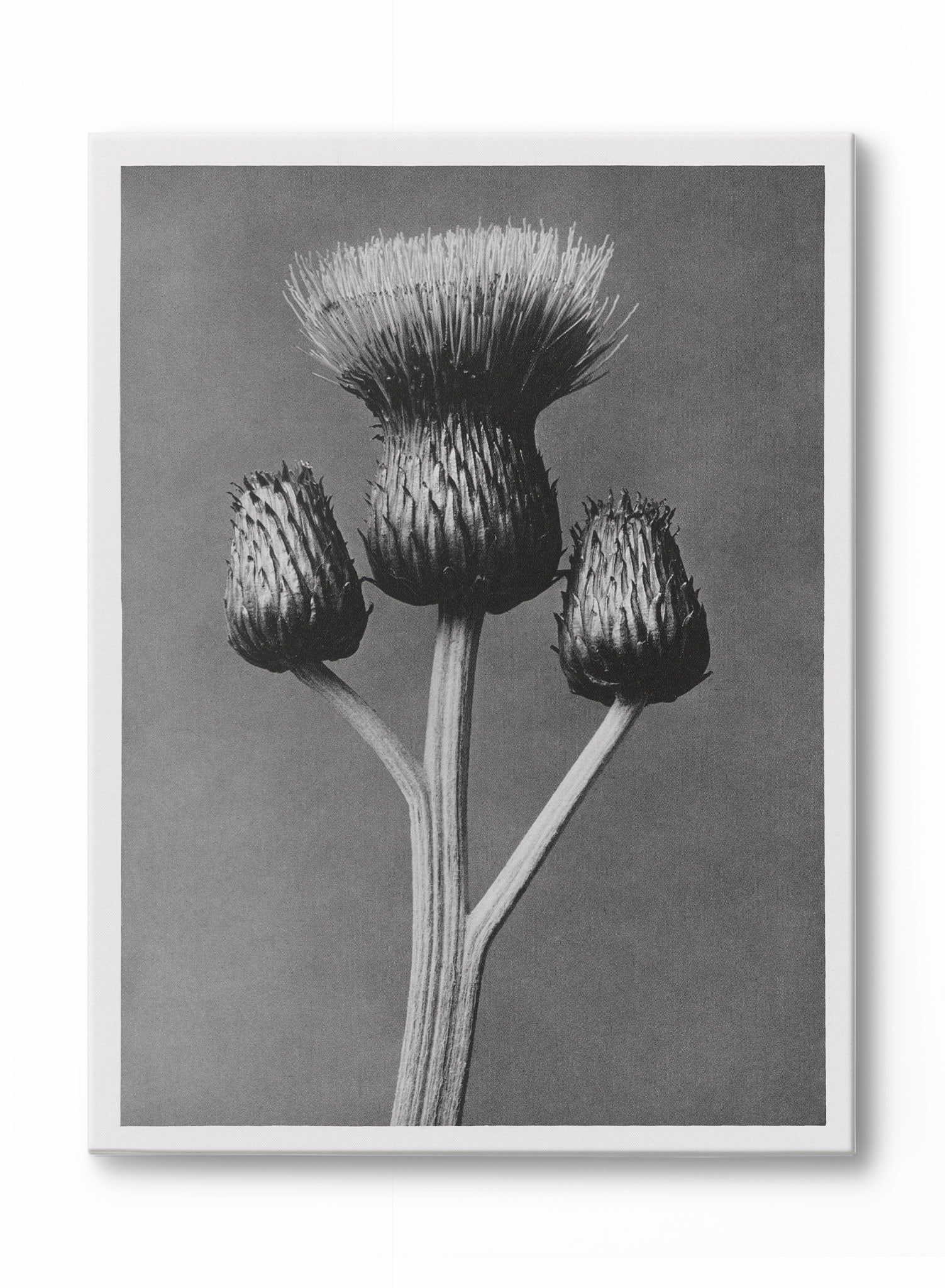 This black-and-white depiction of thistles transforms a rugged, natural plant into a striking, sculptural work of art. The detailed, spiky texture of the thistle heads contrasts beautifully with the smooth, slender stems, giving the piece a dynamic balance between harsh and gentle elements.
